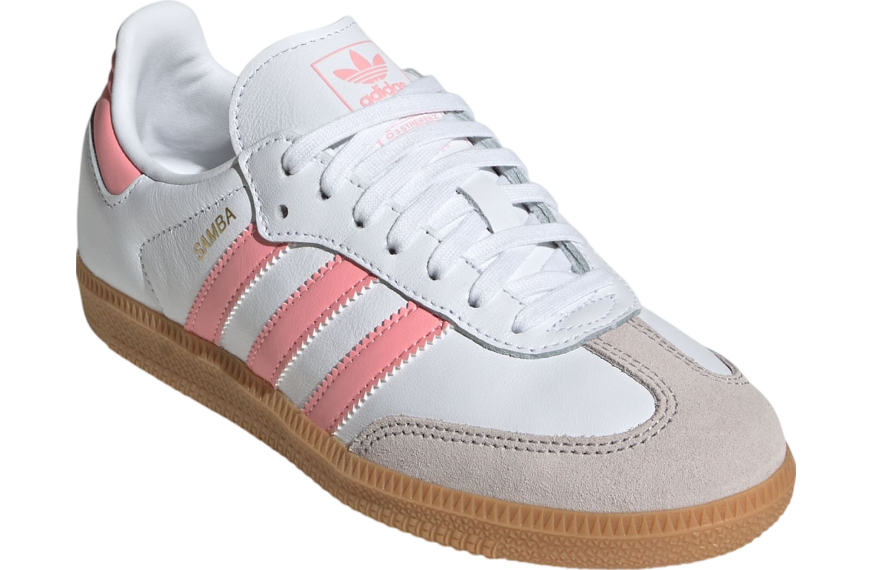 Le Adidas Samba OG Bianco/Rosa rivisitano l’iconica silhouette Samba con un tocco fresco e femminile. La tomaia è realizzata in pelle bianca premium, con sovrapposizioni in suede grigio chiaro sulla punta e le classiche 3 strisce rosa pastello sui lati. Il dettaglio rosa sul tallone e la suola in gomma color gum completano il look, unendo stile rétro e comfort quotidiano. Perfette per outfit casual e streetwear.