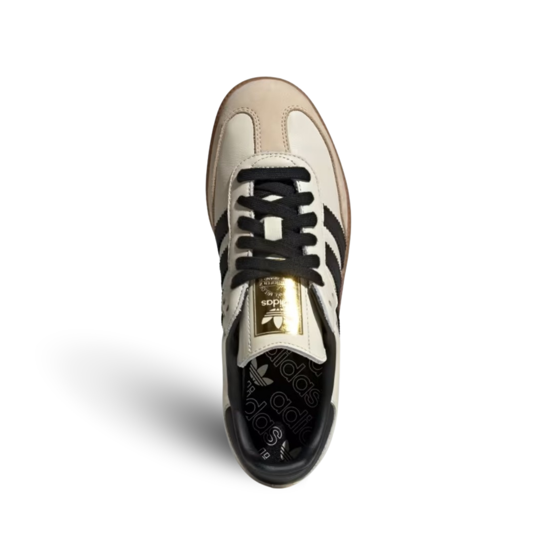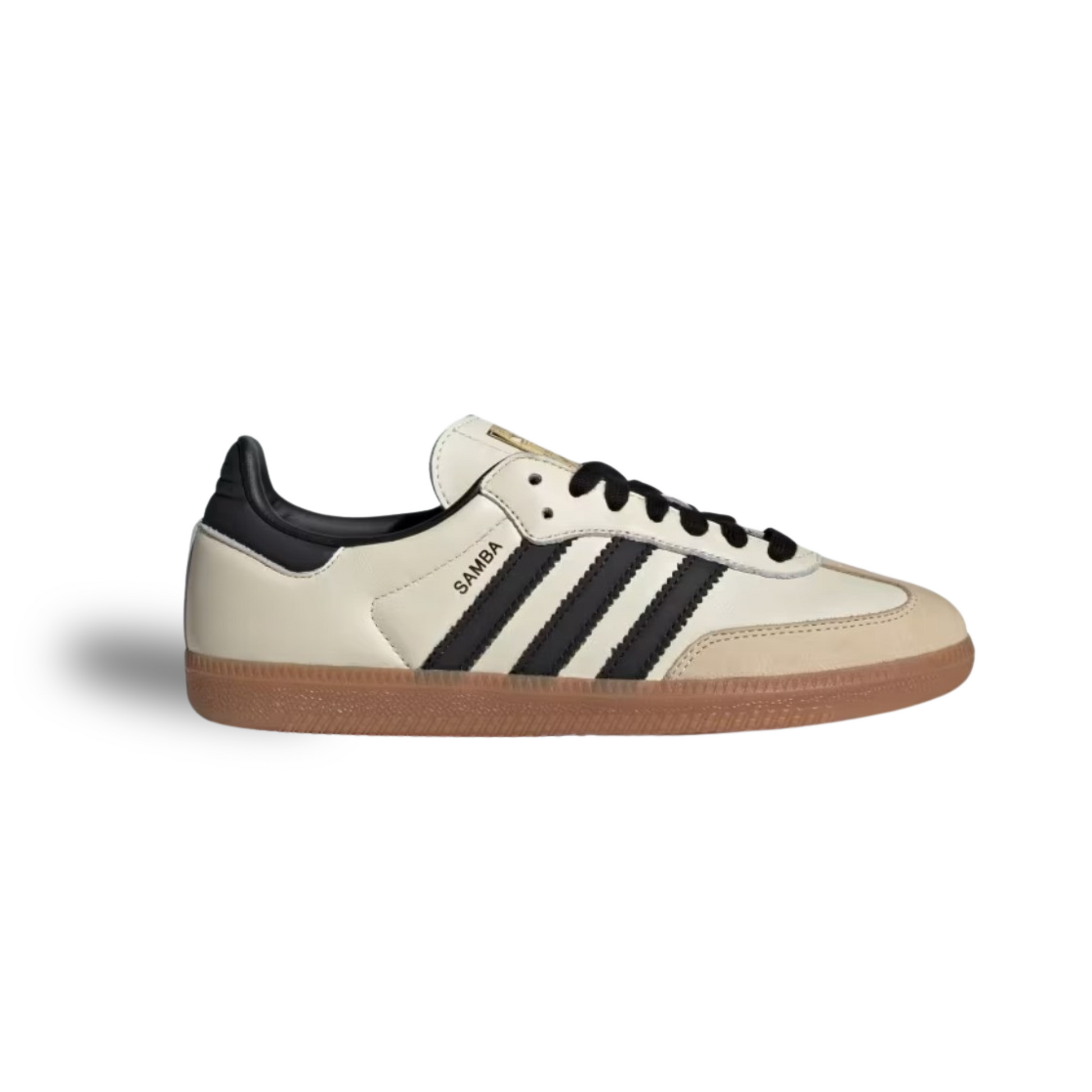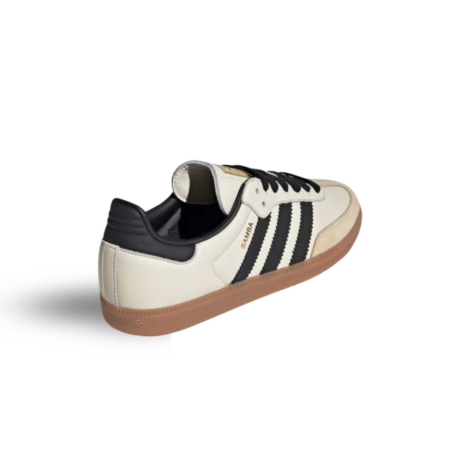 Le Adidas Samba OG Off Beige/Black rivisitano lo storico modello Samba con un look elegante e versatile. La tomaia in pelle color panna con dettagli in suede e le iconiche tre strisce nere donano un contrasto deciso e raffinato. Il logo "Samba" in oro e la suola in gomma marrone completano il design rétro. Un must-have per chi cerca uno stile classico ma sempre attuale.