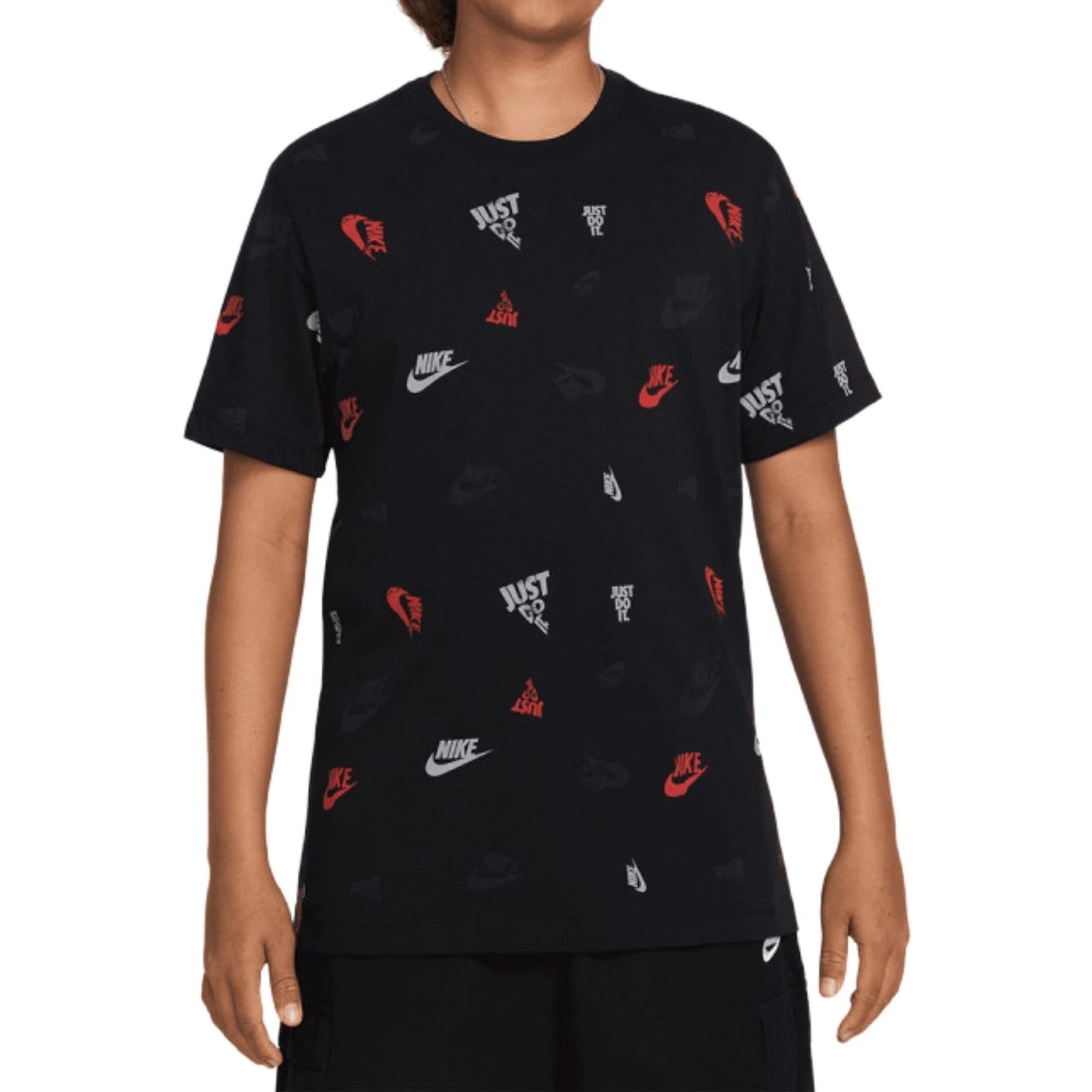 Esprimi al meglio il tuo stile con la T-shirt Nike nera con loghi all over. Realizzata in morbido cotone, questa maglietta presenta una stampa multicolore con il logo Nike e la celebre frase Just Do It, che la rendono unica e perfetta per un look casual e sportivo.