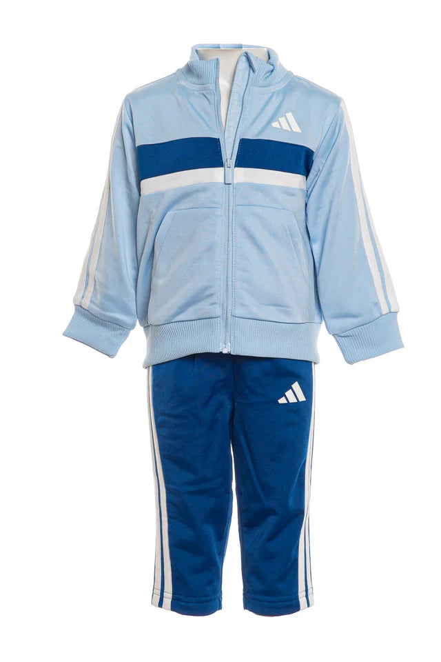 La tuta Adidas azzurra e blu per bambini unisce comfort e stile sportivo. Realizzata in tessuto morbido e resistente, presenta una giacca full zip color azzurro con le iconiche 3 stripes bianche lungo le maniche e il logo sul petto. I pantaloni blu con dettagli bianchi completano il look, perfetto per la scuola, il gioco e il tempo libero.
