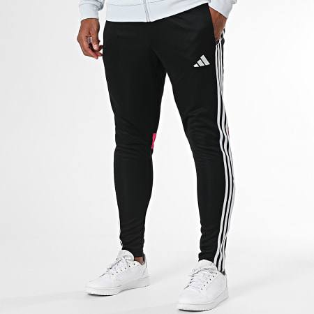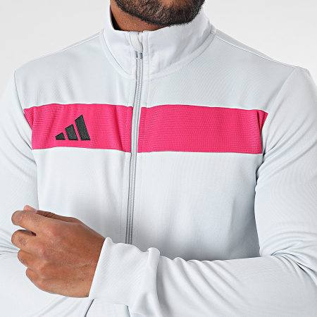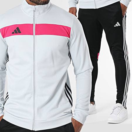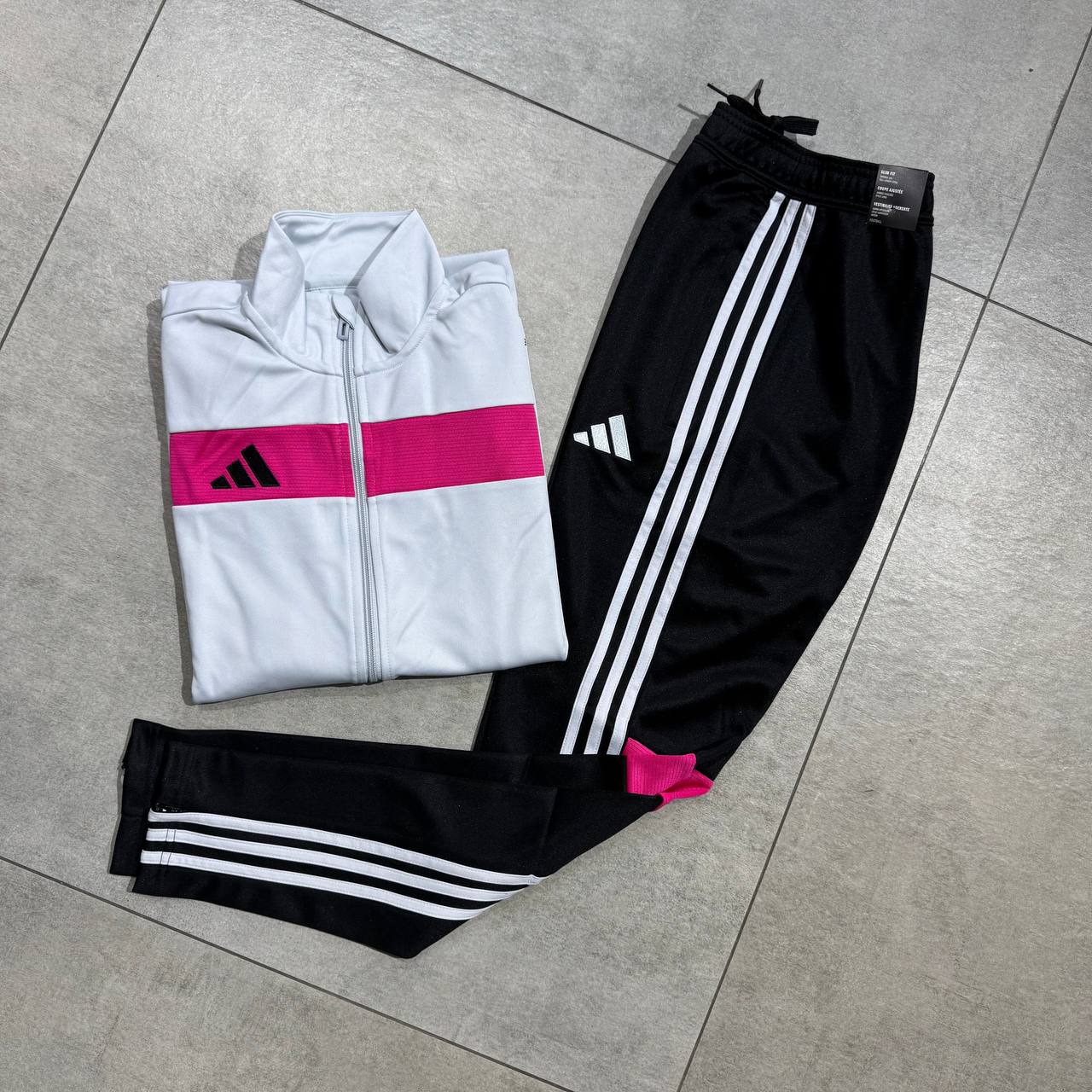 La tuta Adidas grigio chiaro con dettagli rosa combina comfort e design moderno. La giacca presenta una zip parziale con fascia rosa sul petto e logo Adidas, mentre i pantaloni neri coordinati includono le iconiche 3 stripes laterali e un dettaglio rosa sulla gamba. Realizzata in tessuto tecnico traspirante, è perfetta per allenamenti intensi o per un look sportivo e casual nel tempo libero.