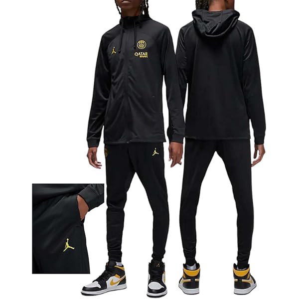 La tuta PSG Jordan nera è il capo ideale per gli appassionati di calcio e streetwear. Realizzata in tessuto tecnico confortevole, presenta felpa con cappuccio e pantaloni coordinati. I loghi Jordan e PSG in giallo aggiungono un tocco esclusivo e deciso. Perfetta per allenamenti, tempo libero e outfit sportivi di tendenza.