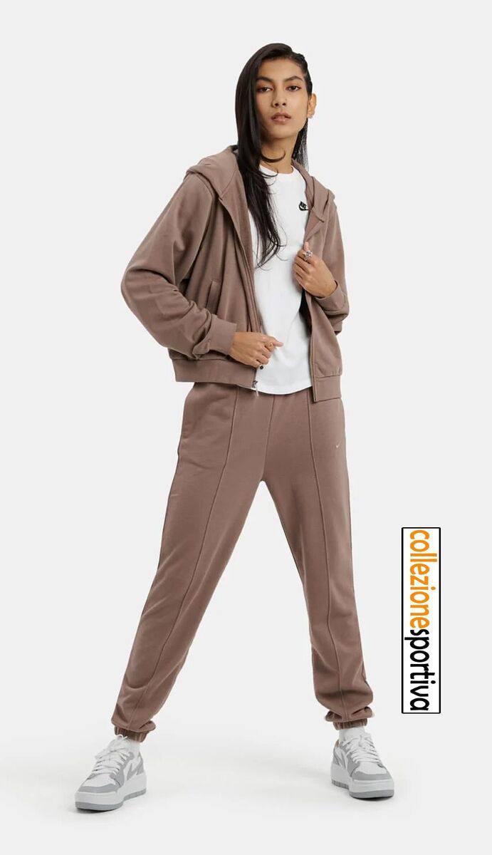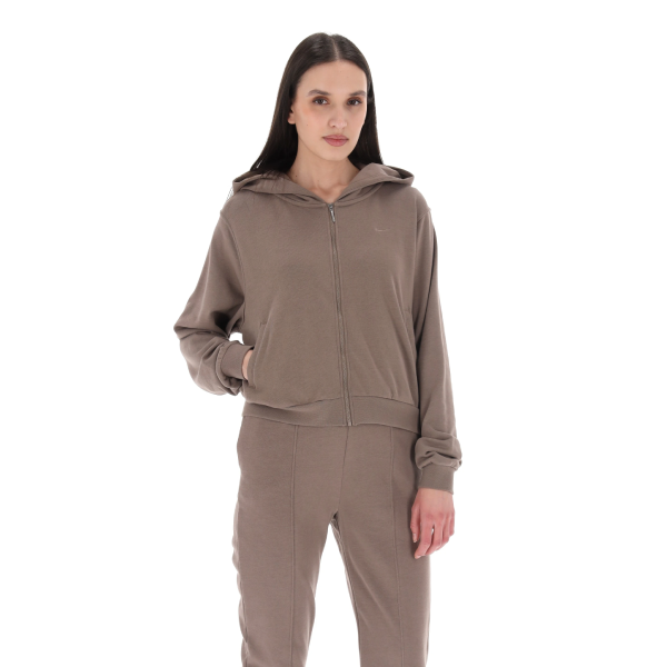 Tuta Nike da donna in beige scuro con cappuccio e zip frontale, realizzata in tessuto morbido e confortevole, ideale per il tempo libero e lo sport, design minimal con logo Nike tono su tono per uno stile moderno ed essenziale.