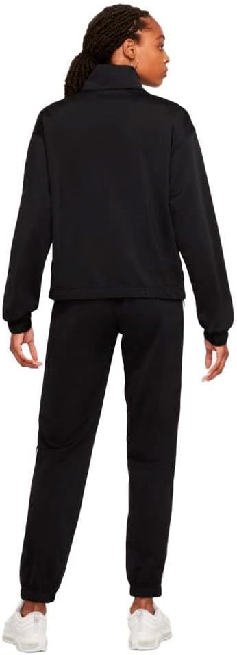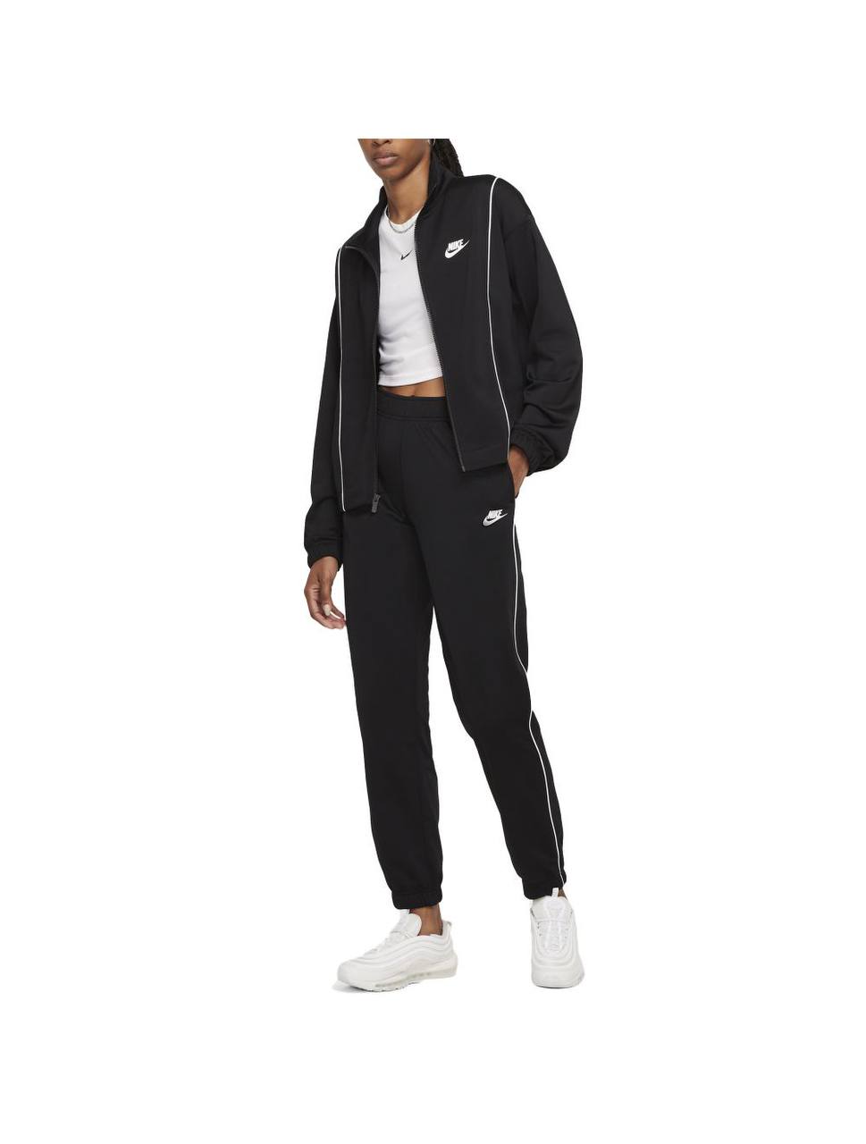 Tuta Nike da donna composta da giacca con zip e pantaloni abbinati, realizzata in tessuto comodo e leggero ideale per sport e tempo libero, colore nero con dettagli bianchi e logo Nike ricamato.